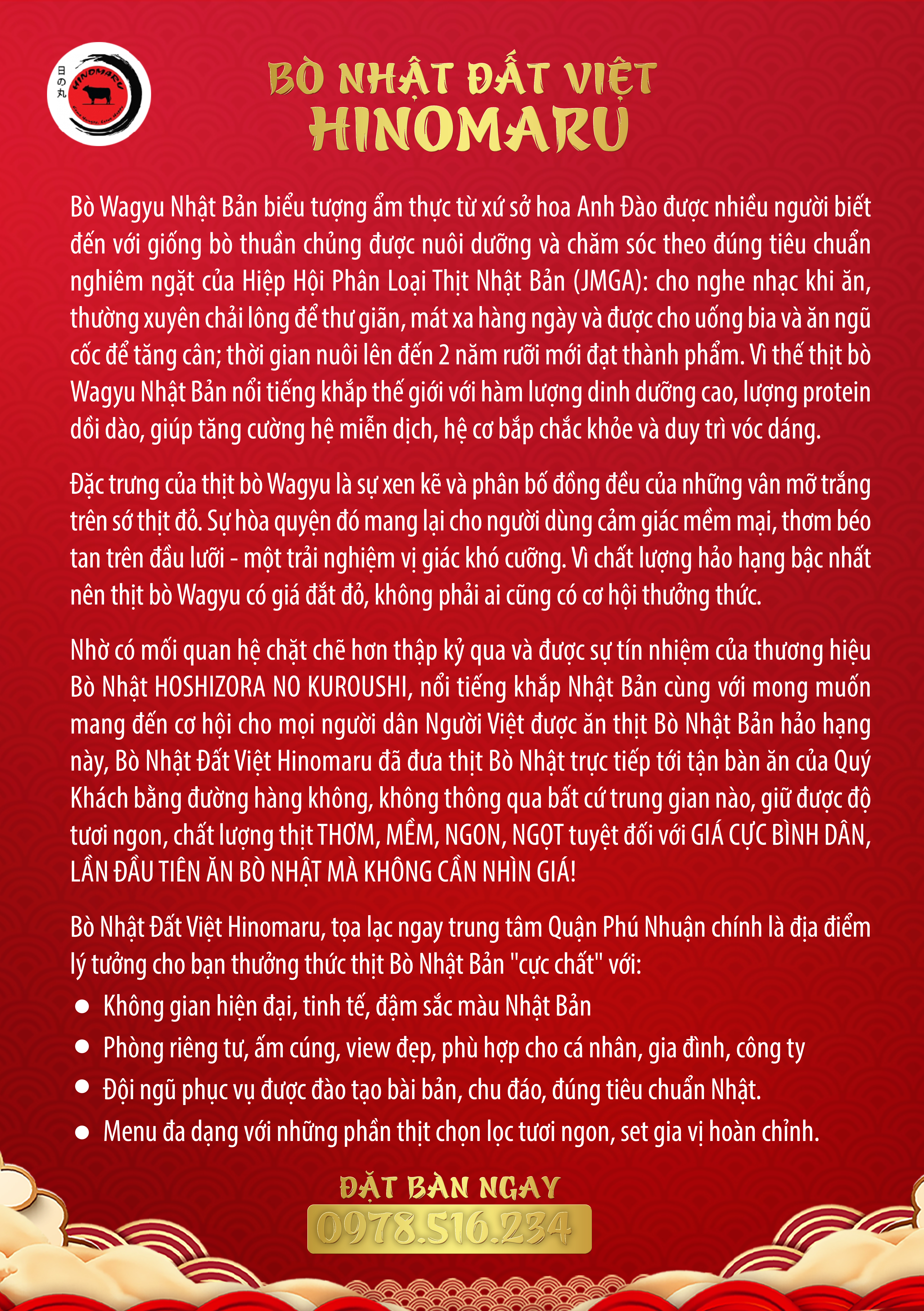 Bò Nhật Đất Việt Hinomaru, tọa lạc ngay trung tâm Quận Phú Nhuận chính là địa điểm lý tưởng cho bạn thưởng thức thịt Bò Nhật Bản "cực chất" với: Không gian hiện đại, tinh tế, đậm sắc màu Nhật Bản Phòng riêng tư, ấm cúng, view đẹp, phù hợp cho cá nhân, gia đình, công ty Đội ngũ phục vụ được đào tạo bài bản, chu đáo, đúng tiêu chuẩn Nhật.